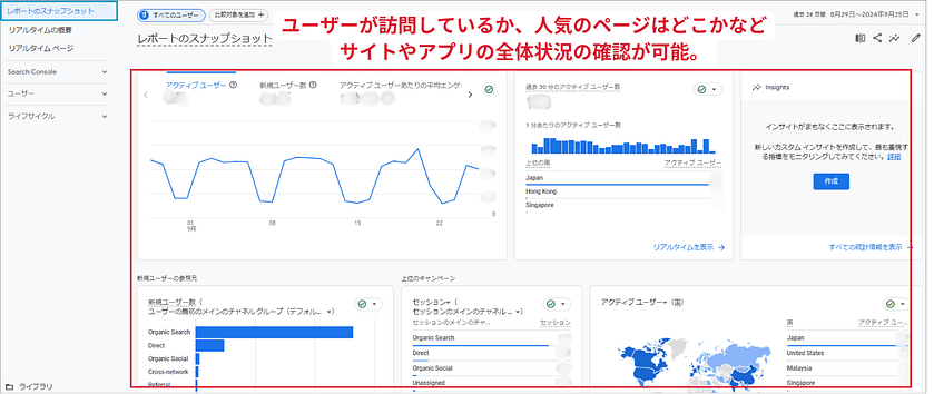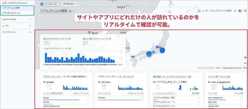 サイトやアプリに訪れているユーザー数や行動、訪問元、閲覧ページなどをリアルタイムに確認でき、ユーザー動向を把握できます。