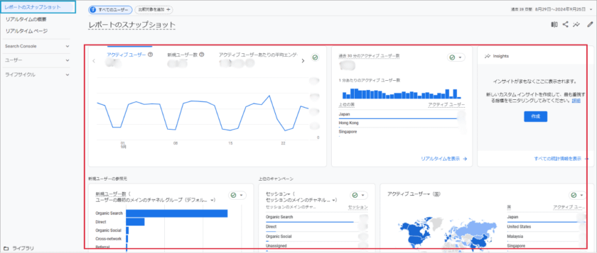 | Insights | GA4が自動的に発見したデータに基づくインサイトやトレンドが表示され、注目すべき変化やパフォーマンス向上の機会を表示。 |