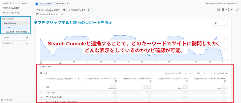 GoogleのSearch Consoleと連携することで、検索エンジンからのデータを表示します。ユーザーがどんなキーワードでサイトに来ているのか、検索結果でどんな表示のされ方をしているのかなど、SEOに役立つデータを確認できます。検索エンジン経由の集客を強化したい場合に便利です。