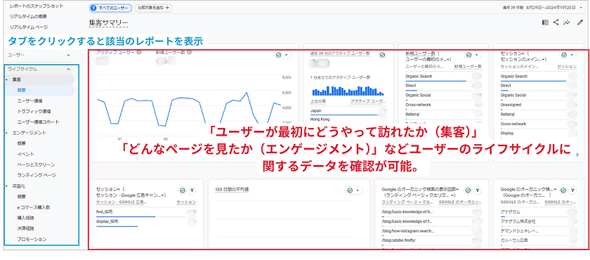 ユーザーがどのようにサイトやアプリを利用しているのか、ユーザーの動きを確認できます。「ユーザーが最初にどうやって訪れたか(集客)」、「どんなページを見たか(エンゲージメント)」、「購入や登録をしたか(キーイベント)」など、ユーザーのライフサイクルに沿ったデータを確認できます。