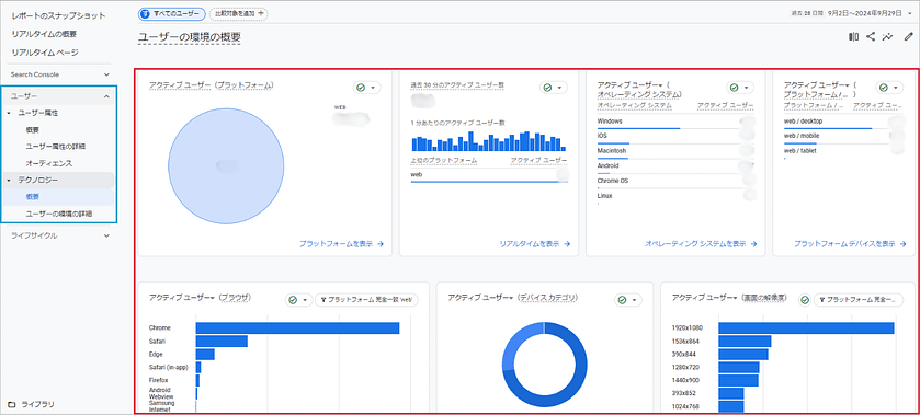 | アクティブユーザー(ブラウザ) | ユーザーが使用しているブラウザ(例:Chrome、Safari、Firefox、Edgeなど)を表示。 |