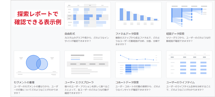 一方、「探索レポート」は、特定のデータを深掘りして分析したい時や、「コホートデータ探索」や「目標到達プロセス」など標準レポ-トでは表示できない多様な形式でデータを視覚化する事に優れています。標準レポートで全体を把握、詳細は探索レポートで分析と使い分けることをおすすめします。