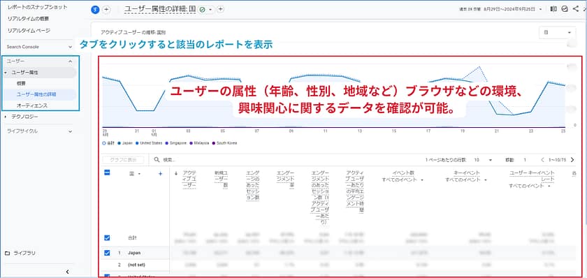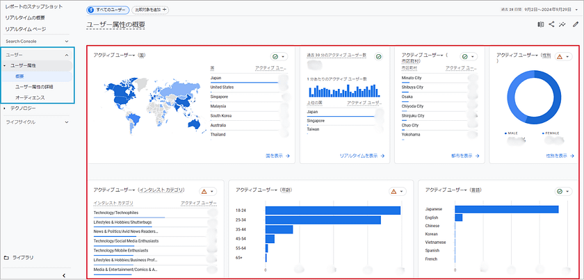 GA4ホーム画面「レポート」>「ユーザー」>「ユーザー属性」>「概要」をクリックで閲覧できます。