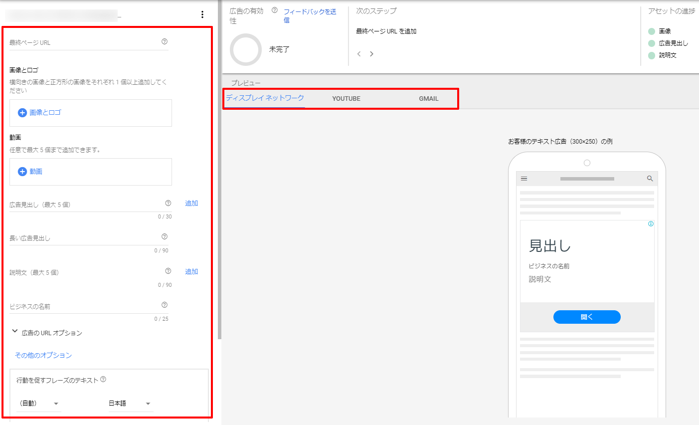 プレビューを確認しどのように広告が表示されるのかをイメージしながら入力をしましょう。ディスプレイネットワーク、YouTube、Gmailと掲載される場所ごとにプレビューを確認できます。