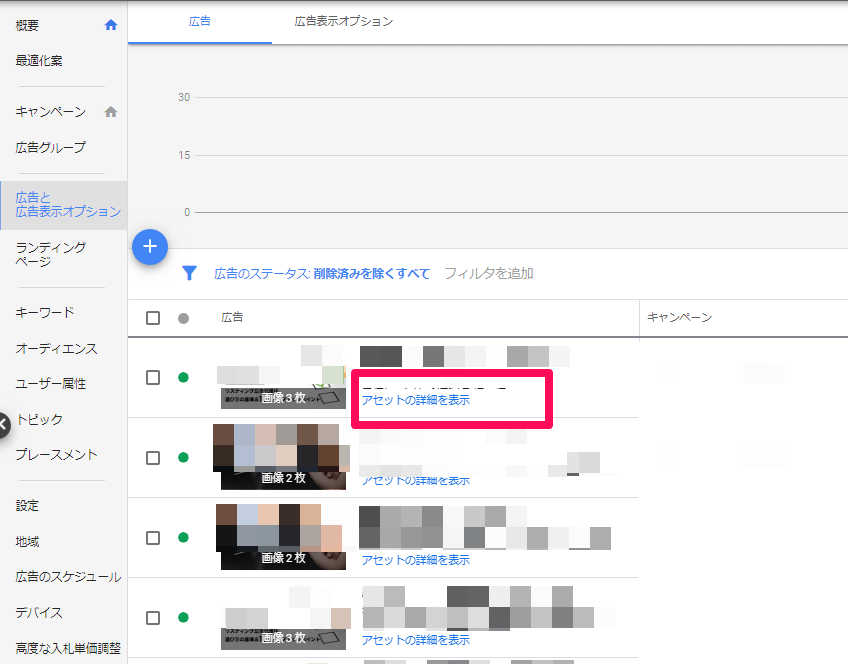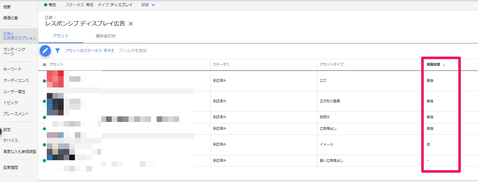 これらの結果に基づいて、広告の成果を改善して行きましょう。成果の広告があればその方向性のアセットを増やし、逆に評価が低いものがあれば差し替えていきましょう。