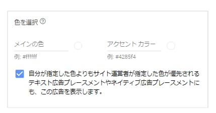 また、これに加えてオプションで広告フォーマットの「色を選択」することが可能です。ただし、サイト運営者側が広告の色を指定している広告スペースも存在しているため、サイト運営者側の色の指定が優先される広告枠へ表示するか否かを選択可能です。