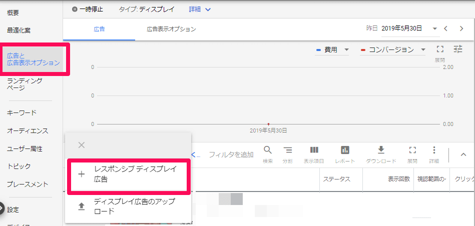 「広告と広告表示オプション」タブへ移動し、「+」ボタンを押して「+レスポンシブ ディスプレイ広告」を選択します。