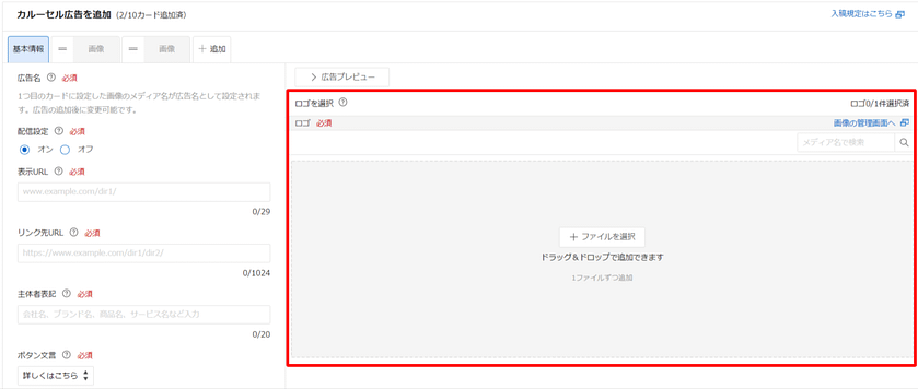ロゴ 広告内に表示する画像を設定します。一覧で表示された登録済みの画像から選択するか、「画像を追加」ボタンまたはドラック&ドロップで新しい画像を追加します。
