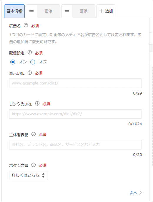 主体者表記 広告の主体者を明確にするために会社名、ブランド名、商品名、サービス名のいずれかを入力します。 20文字以内