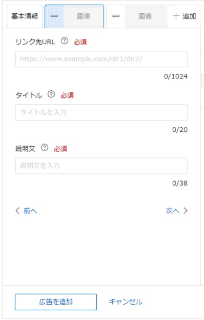 広告名 1つ目に設定した画像の画像名が自動的に設定されます。広告を追加した後に変更可能です。