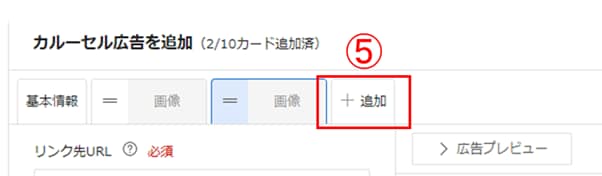 ⑤カルーセルカードは10枚まで追加することができます。カルーセルカードを追加する場合は、「+追加」をクリックします。また、カルーセルカードの順番は「画像」タブをドラッグ&ドロップすることで入れ替えることができます。