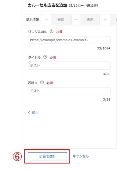 ④「次へ」をクリックすると「画像」のタブに遷移します。ここではカルーセルカードを作成します。