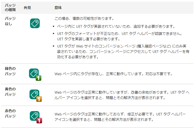 なお、タグの実行ステータスによってUET Tag Helperのアイコンに表示されるバッジの色が変わります。もし、エラーが発生している場合はメッセージを確認し技術担当者と相談のうえ適切に対処しましょう。