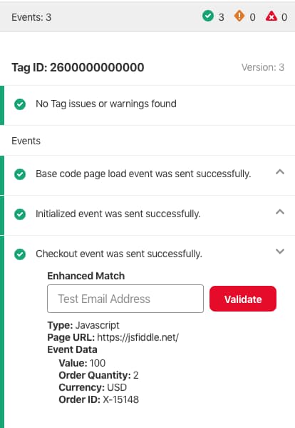 Meta Pixel Helper同様、アイコンをクリックするとパネルが展開され、タグの実行状況が確認できます。