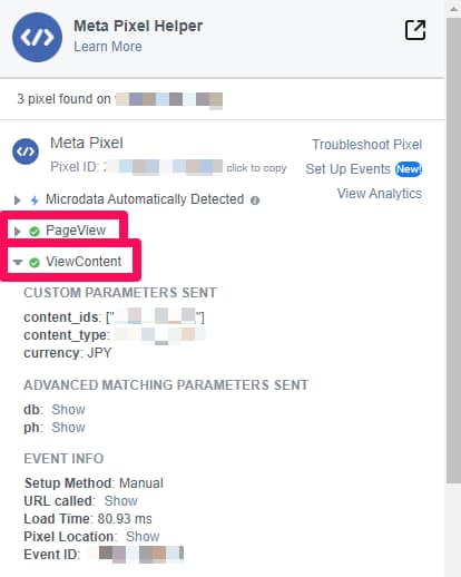 また、各イベントの左横の「▶」をクリックすると各イベントでMetaに送付している詳細な情報(商品IDや価格など)が表示されるので、併せて確認しましょう。