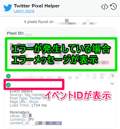 Twitterピクセルが検出され不適切なパラメータ値が設定されていた場合、エラーメッセージが表示されます。エラーが発生している際は技術担当者と相談のうえ適切に対処することをおすすめします。