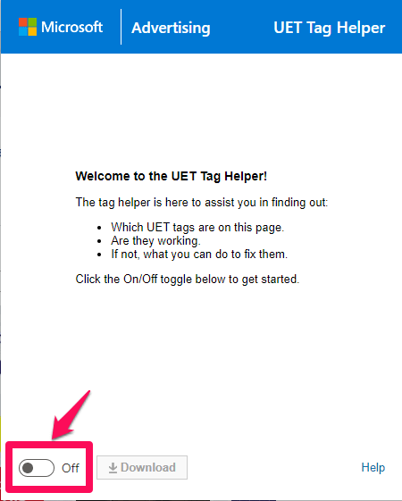 タグの実行状況を確認したいページにアクセス後、UET Tag Helperをクリックし画像左下のチェックボックスをOFF→ONに変更しリロードします。