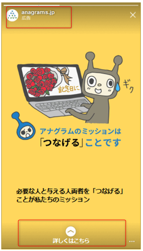 Instagramを見ていると、ストーリーズ広告で左上のアカウントロゴ、下部のスワイプアップのボタン(図の赤枠部分)が、クリエイティブ内のテキストと被り見えづらくなっている、もったいないクリエイティブを目にすることがあります。