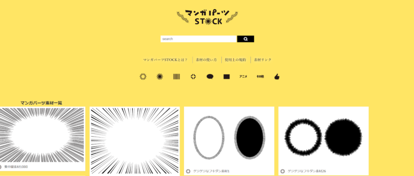 • 漫画パーツに特化した素材サイトで、集中線やモノクロのテクスチャ素材を提供