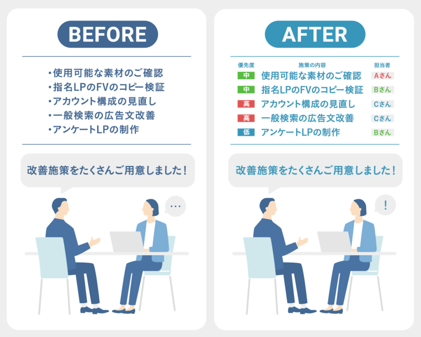 上の「BEFORE」の例のように改善施策を羅列するだけでは、優先度がわかりにくいですよね。「まずは工数負担が少なく、改善インパクトの大きい3案から進めていきましょう」といったように、優先順位を提示することによって、クライアント側の判断負荷を大きく下げることができます。