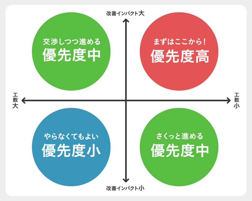 - 施策の優先順位を定める:改善インパクトが大きく実行のハードルが低い施策か?