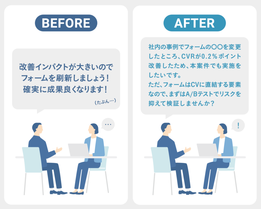 クライアント側もフォームに課題を感じていたとしても、実行にリスクやコストが伴う提案には慎重になるものです。「AFTER」の例は実際の事例が添えられていてリスクにも配慮されており、「それならやってみようかな」という気持ちになりますよね。このように、提案に至った背景・具体的な根拠や理由をセットで伝えることが、納得感を生む鍵になります。