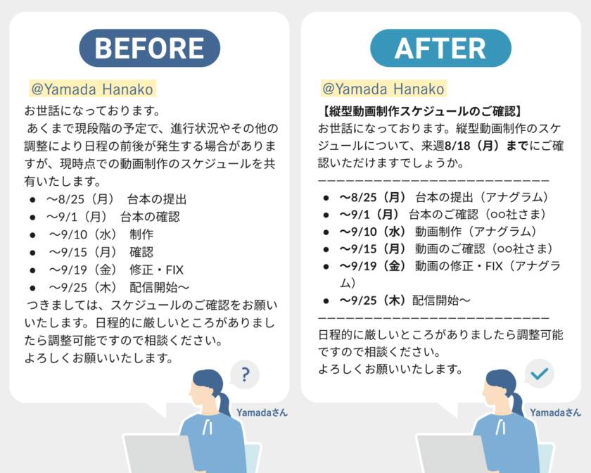 「BEFORE」の例は最後まで読まないと内容が伝わりにくく、「確認」が誰の担当なのかも不明瞭です。一方で「AFTER」の例は冒頭に表題や締め切りが書かれており、「スケジュール確認依頼」だということがわかりやすく、相手に負荷をかけない伝え方になっています。緊急の用事だったら直接通話したり、ログとして残しておいた方が良さそうな内容だったら文章に起こすなど、目的によってツールを使い分けることも大切です。