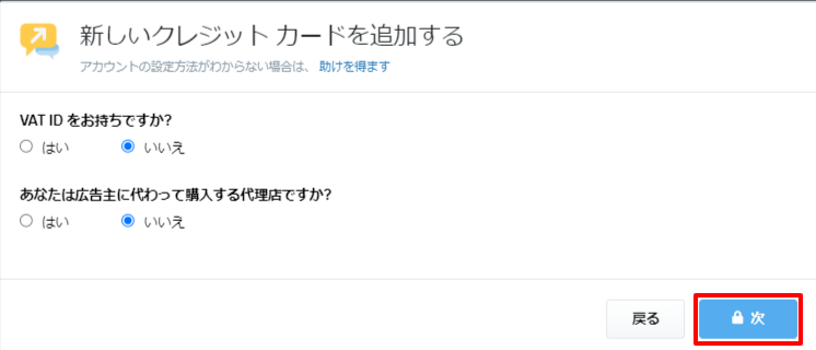 今回はインハウス運用、または広告主所有の広告アカウントを広告代理店が運用代行する場合を想定のため、「いいえ」を選択します。