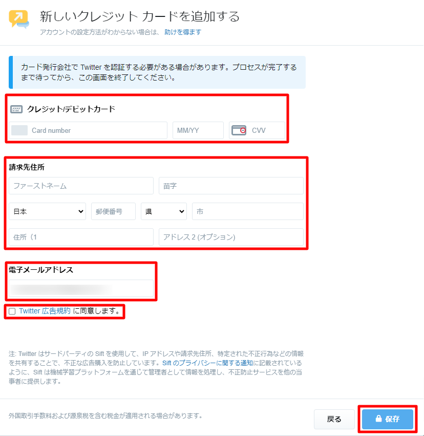 ⑤広告費の支払いに利用するクレジットカードの情報、住所を入力、メールアドレスを確認し、広告規約に同意して「保存」をクリックで支払い設定は完了です。