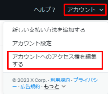 ①広告管理画面右上の「アカウント」のプルダウンメニューから「アカウントへのアクセス権を編集する」をクリック