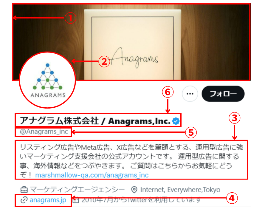 - プロフィールに会社のHPやサービス・ブランドページのURL(④)を設定する