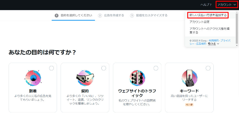 X広告アカウントの作成が完了したら、広告費の支払い方法の設定をしていきます。