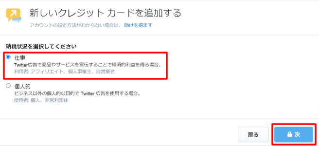 商品やサービスの宣伝目的で利用する場合は「仕事」を、個人的に利用しているアカウントのインプレッションを増やしたいなど個人的な広告利用の場合は「個人的」を選択します。