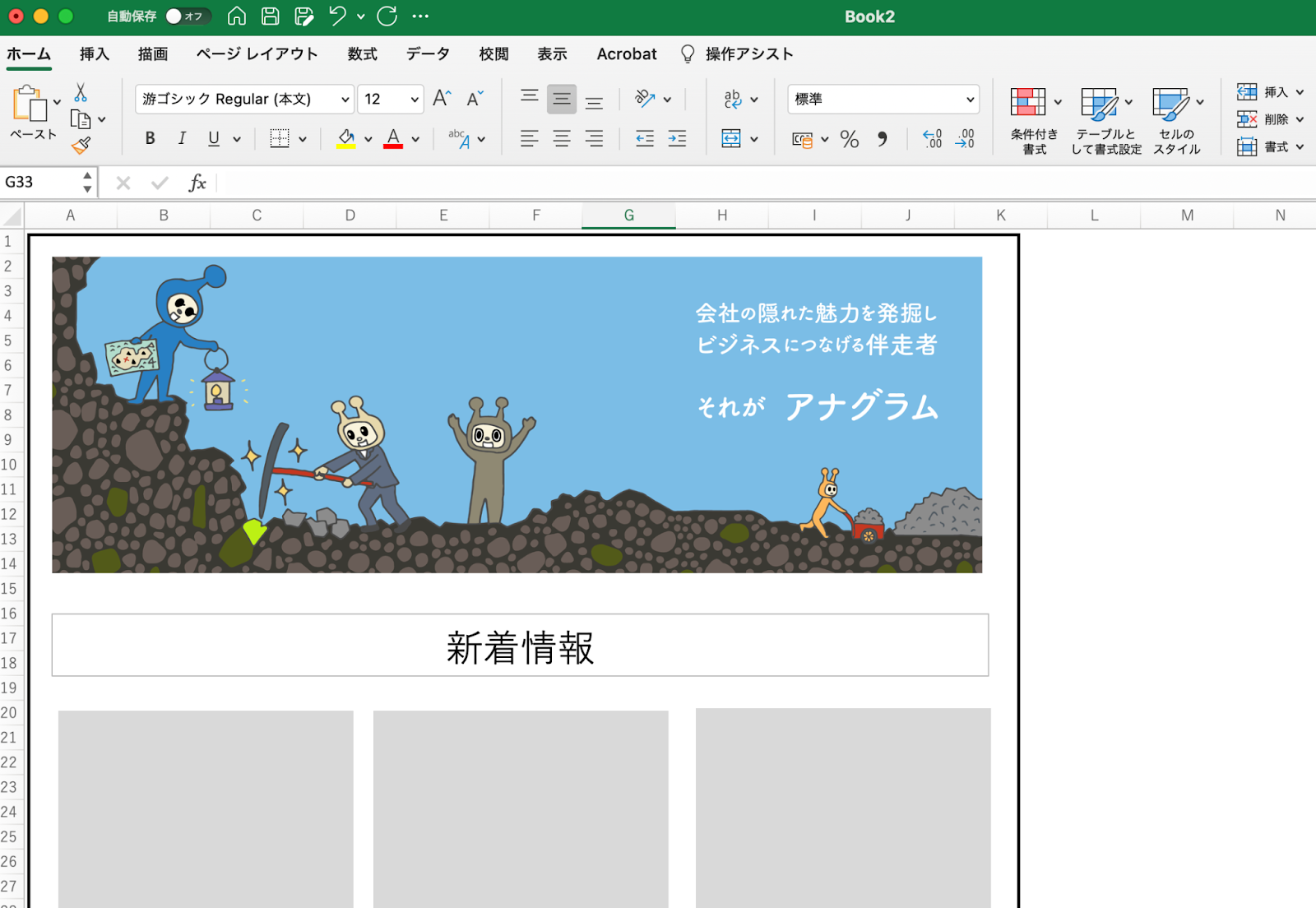 「挿入」タブにある「写真」や「図形」、「テキスト」内のテキストボックスを使うと、セルの影響を受けずに自由に要素を配置することができます。