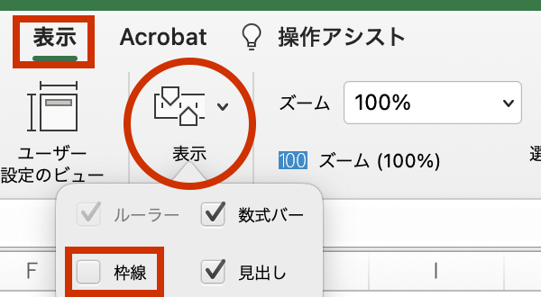 またセルの枠線は「表示」タブの「表示」内で「枠線」のチェックを外すと消すことができます。