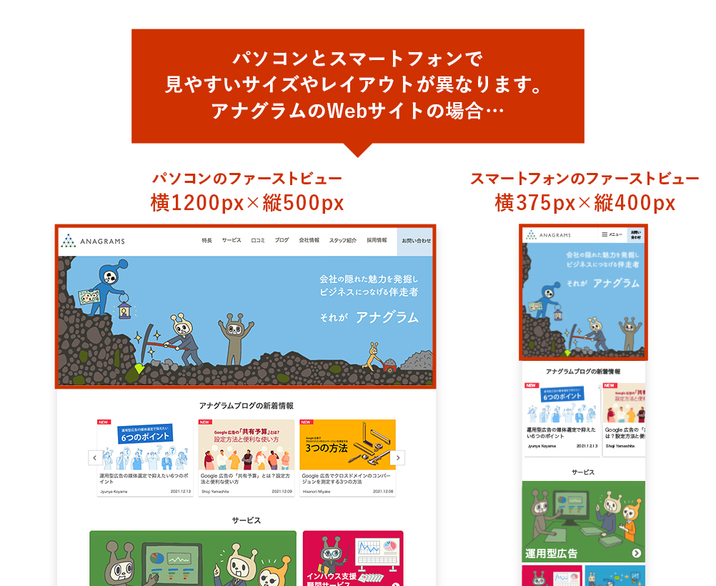 ランディングページはパソコンとスマートフォンで共通のものを使用することもあれば、各デバイスに合わせてレスポンシブ仕様にすることもあります。