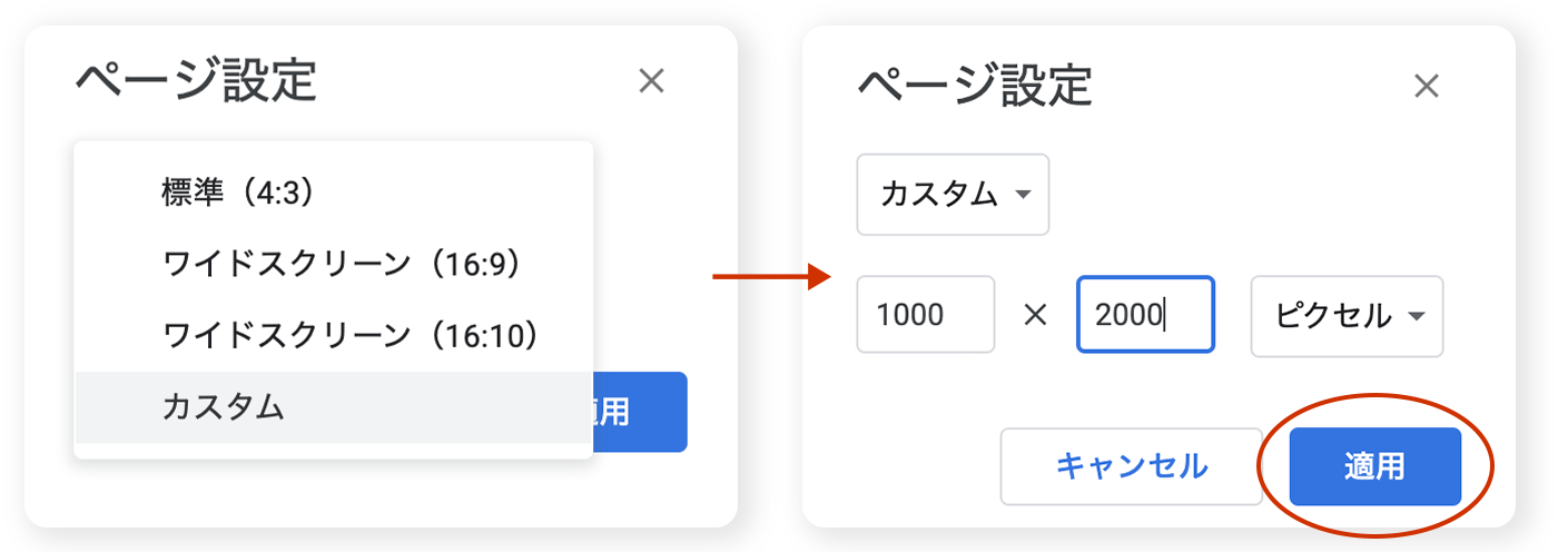 「ファイル」 >「 ページ設定」の「カスタム」を選択するとアートボードのサイズを自由に変更することができます。