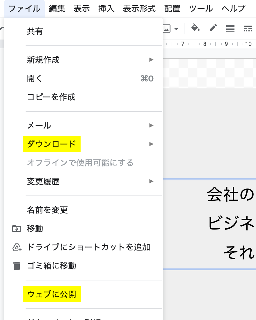 「ファイル」>「ダウンロード」からJPGやPNG、PDFなどの画像形式で保存したり、「ファイル」>「ウェブ公開」からダウンロードパスや埋め込みリンクを発行することも可能です。