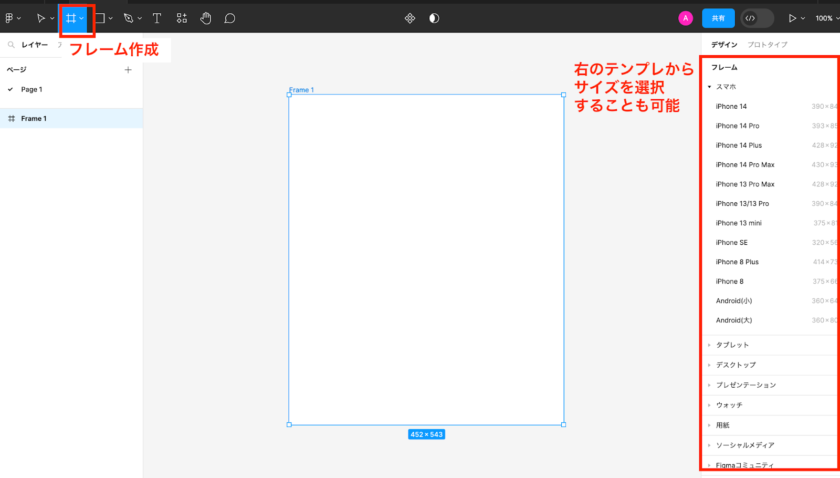 ファイルを開くと灰色のアートボードが広がっているので、この上に左上のアイコンからフレームを作成します。もしくはアイコンを選択した状態で右側に出てくるテンプレートから最適なサイズを選択します。