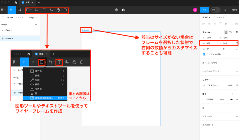 該当するサイズが無い場合はフレームを選択した状態で右側の数値を変更すると自由にカスタマイズすることができます。左上の図形ツールやテキストツールを使ってワイヤーフレームを作成していきましょう。画像や動画は図形ツールのタブの1番下から配置することができます。