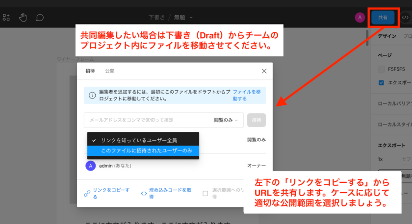 ワイヤーフレームをURLで共有したいときは右上の「共有」ボタンを押します。公開範囲を「リンクを知っているユーザー全員」にすると誰でも閲覧することができ、「このファイルに招待されたユーザーのみ」にすると、メールアドレスを入力して招待した相手だけに公開することができます。