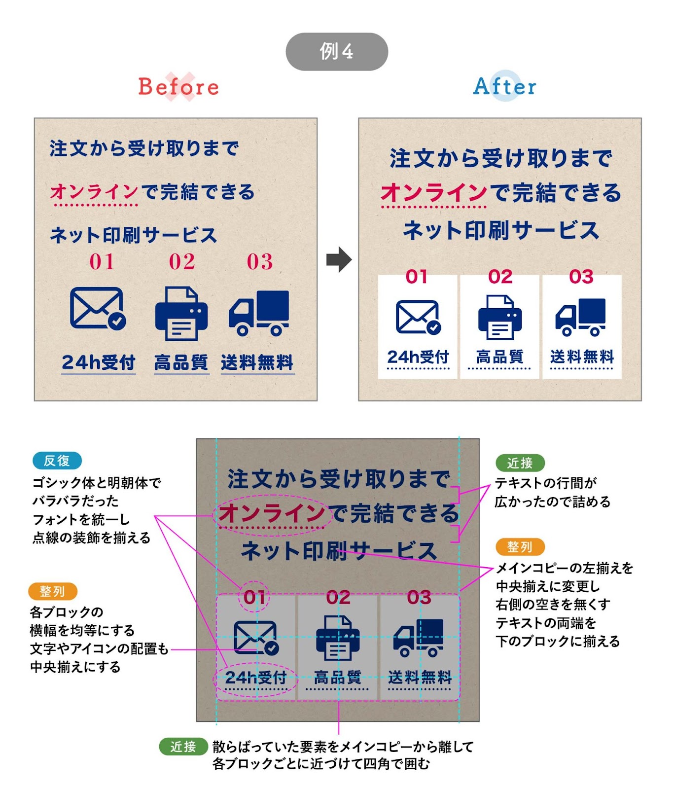 先ほどの修正で使ったのは「デザインの基本原則」と言われる簡単な4つのルールだけです。まずはこれを意識するだけで、デザインは見違えるように変わります。