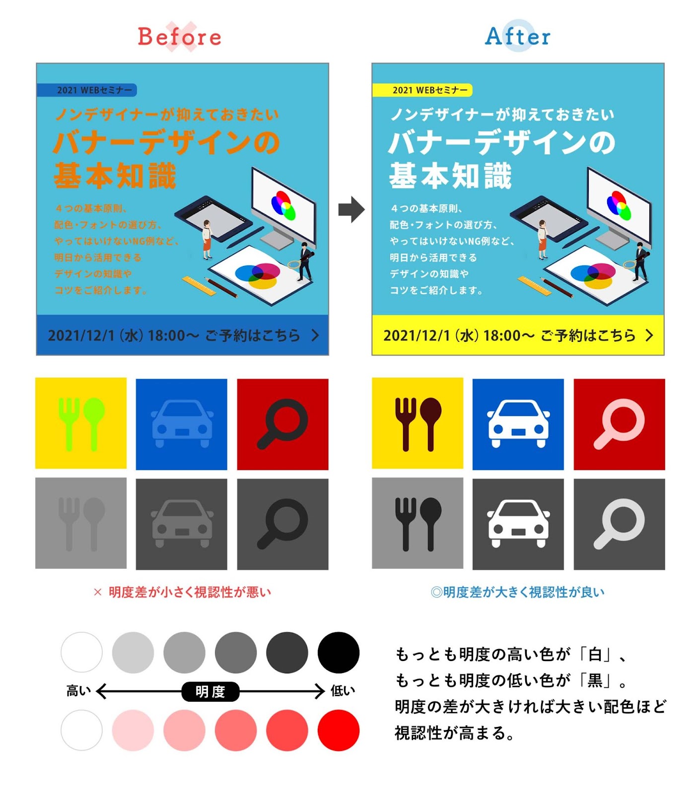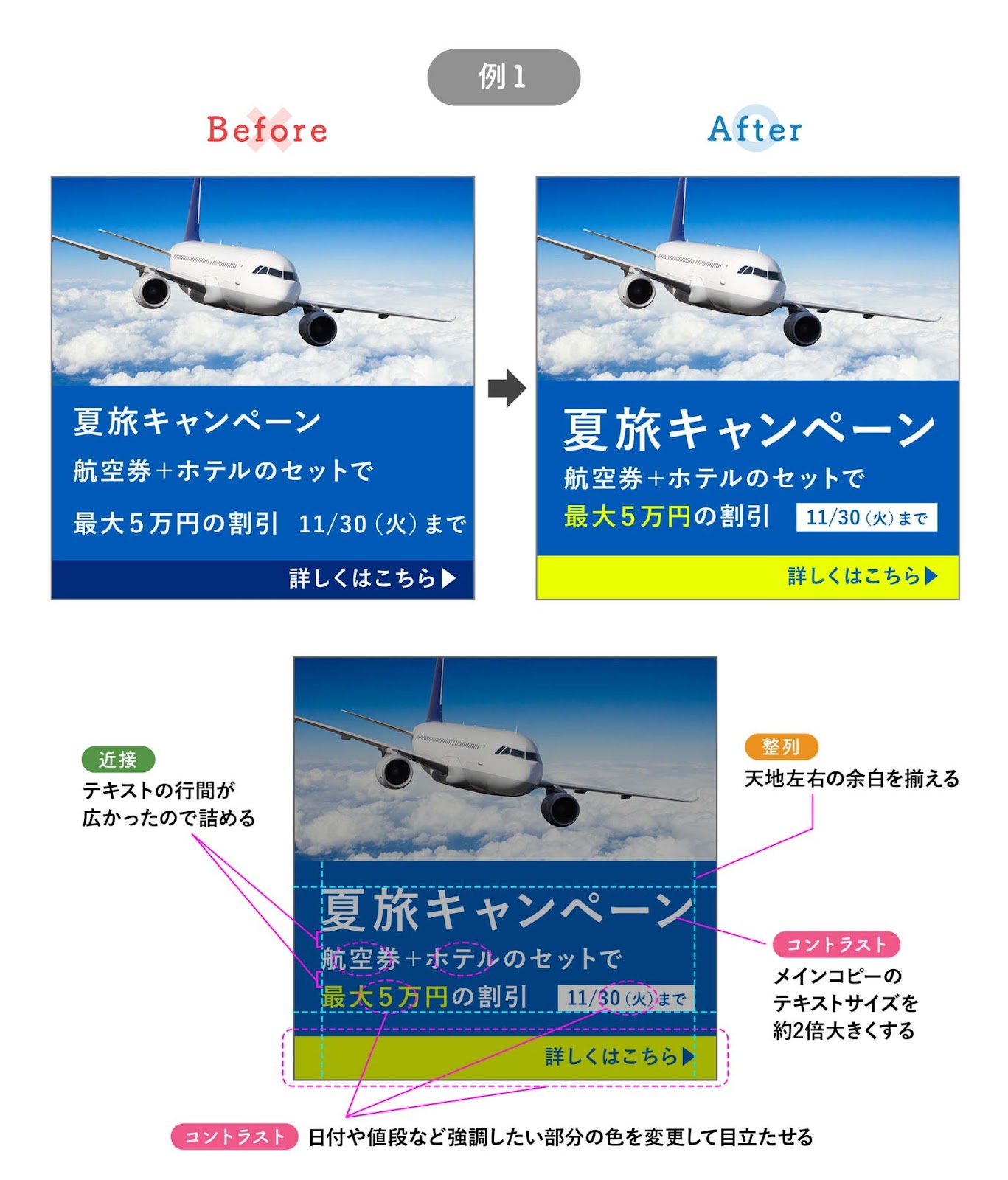 このようにデザインの基礎知識を身につけるだけで、バナー広告の印象を大きく変えることができるようになります。