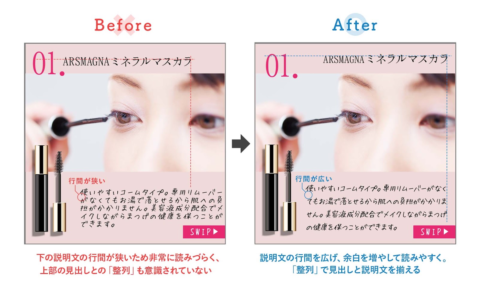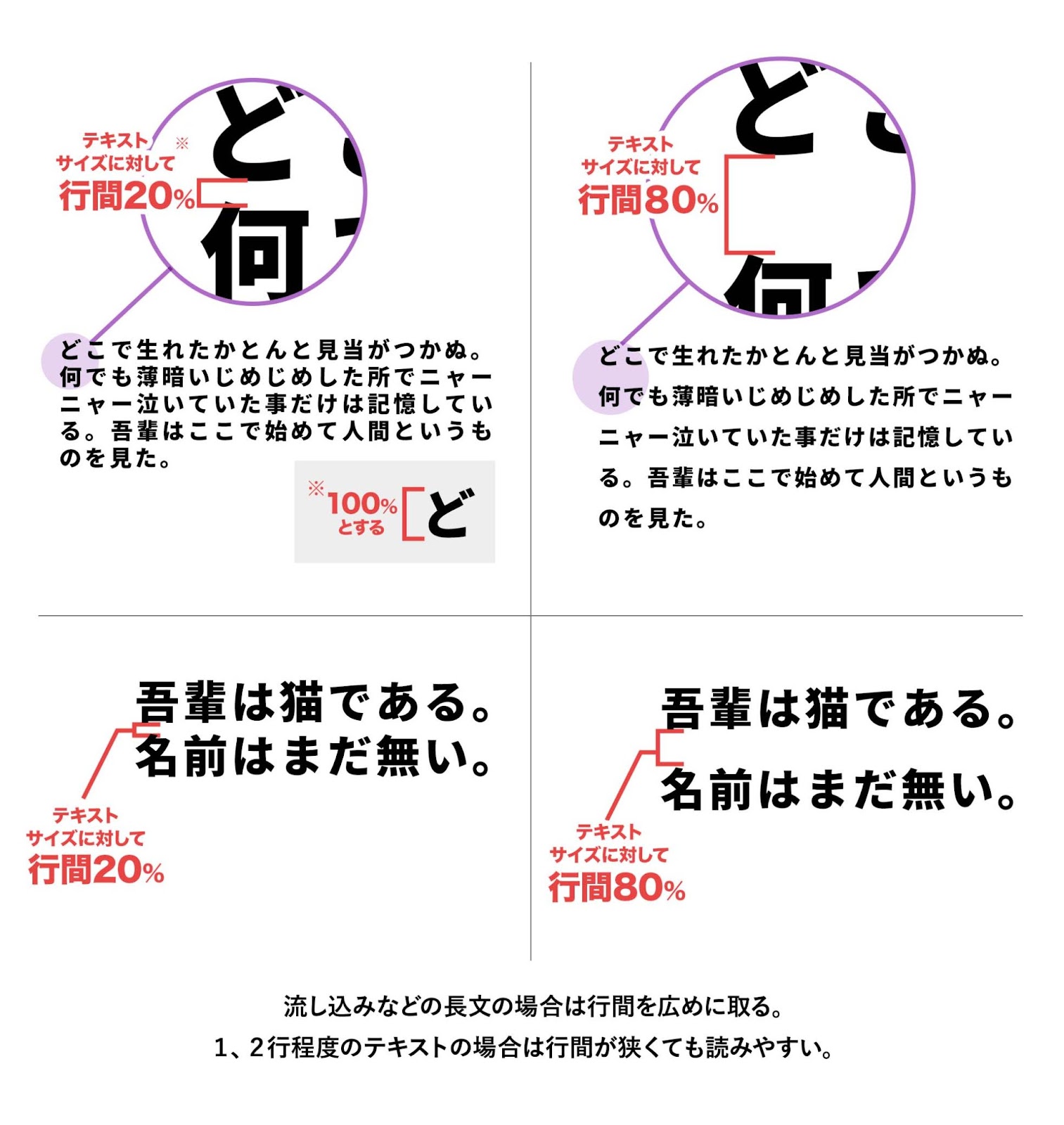またフォントと同じくらい大切なのがテキストの行間です。流し込みなどの長文テキストは行間が狭いと非常に読みづらくなります。読み飛ばされないためにも行間を広めに取るようにしましょう。テキストサイズを100%とすると、だいたい行間を50〜80%程空けるのが適切です。見出しなどの1、2行程度のテキストであれば行間が狭くても読みやすいため、必ずしも行間を広めに取る必要はありません。