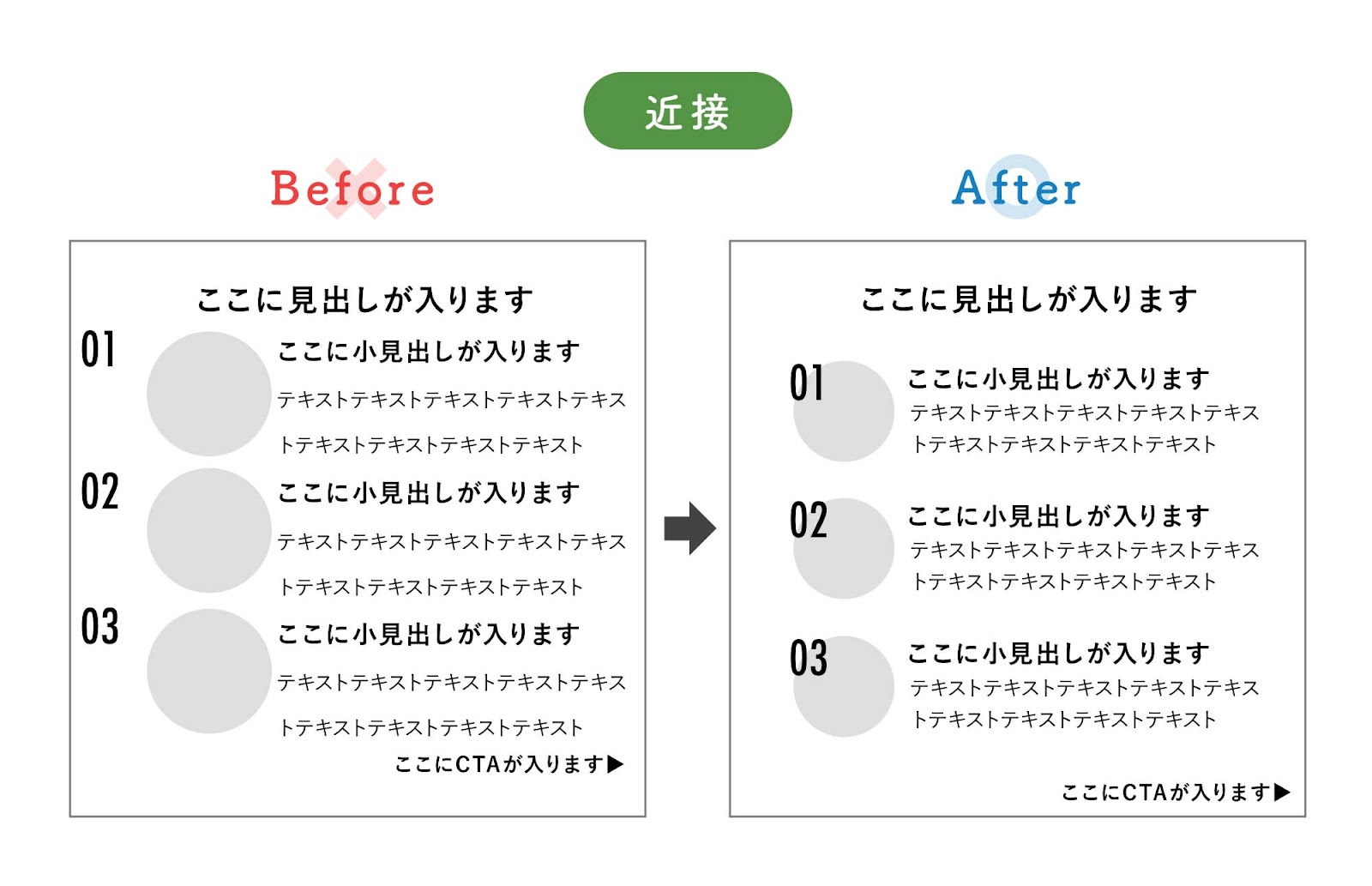 関係性のある複数の要素をグループ化し、まとまった1つの要素として見せる役割を持つのが「近接」です。