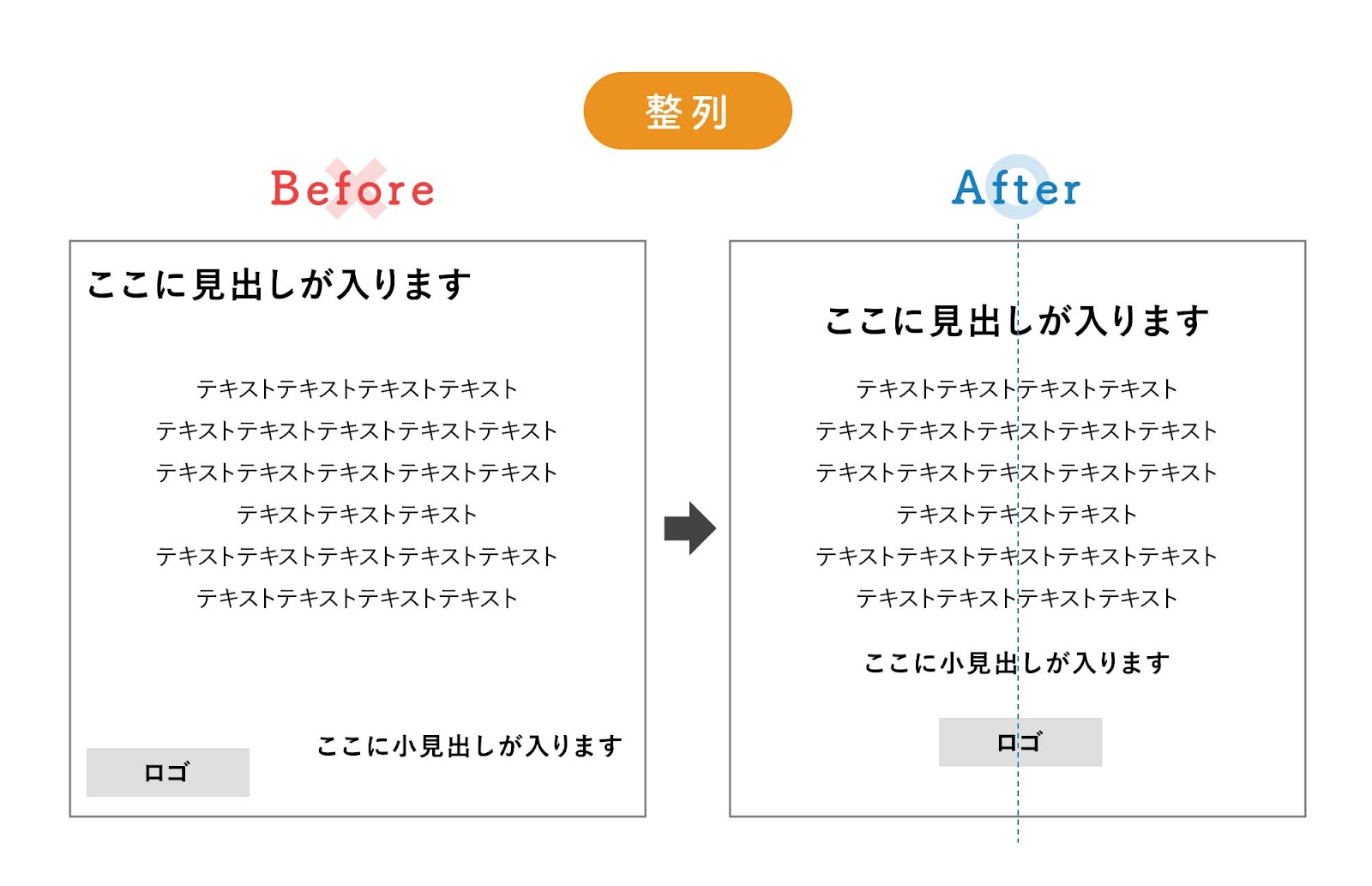 Beforeの図を見ると要素がまんべんなく散らばっており、数字や小見出しの関係性や各ブロックの区切りがわかりづらく、情報を的確に理解することが難しくなります。
