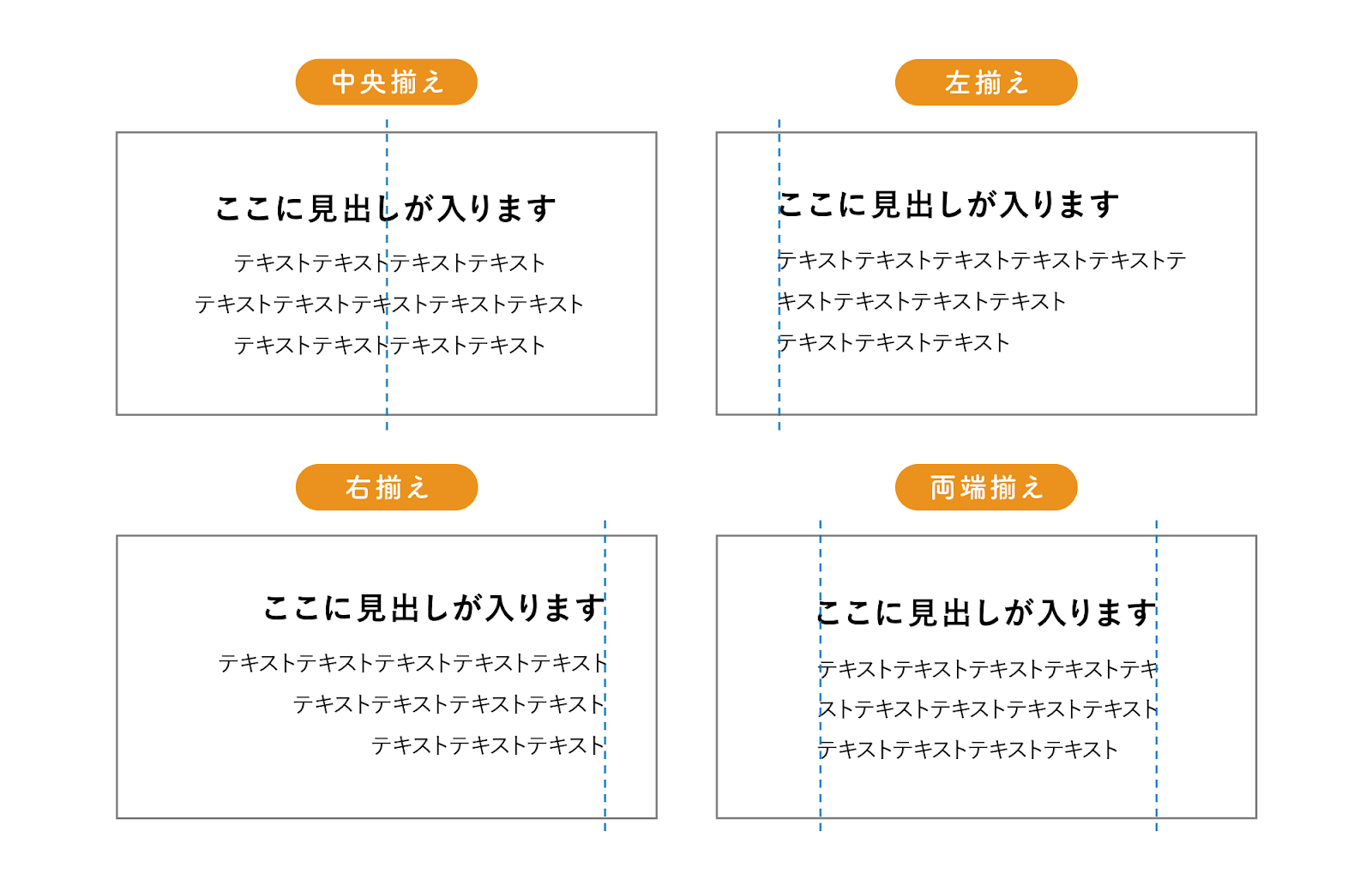 注意点として、なるべく1つのデザインに3種類以上の文字揃えを使わないようにしてください。統一感がなくなるだけでなく、視線の流れや読む順序を悩ませることになります。
