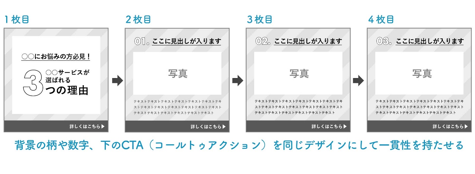 カルーセル広告の場合は、見出しのデザインや色、背景や装飾などを揃えることで全体に統一性を作り出すことができます。