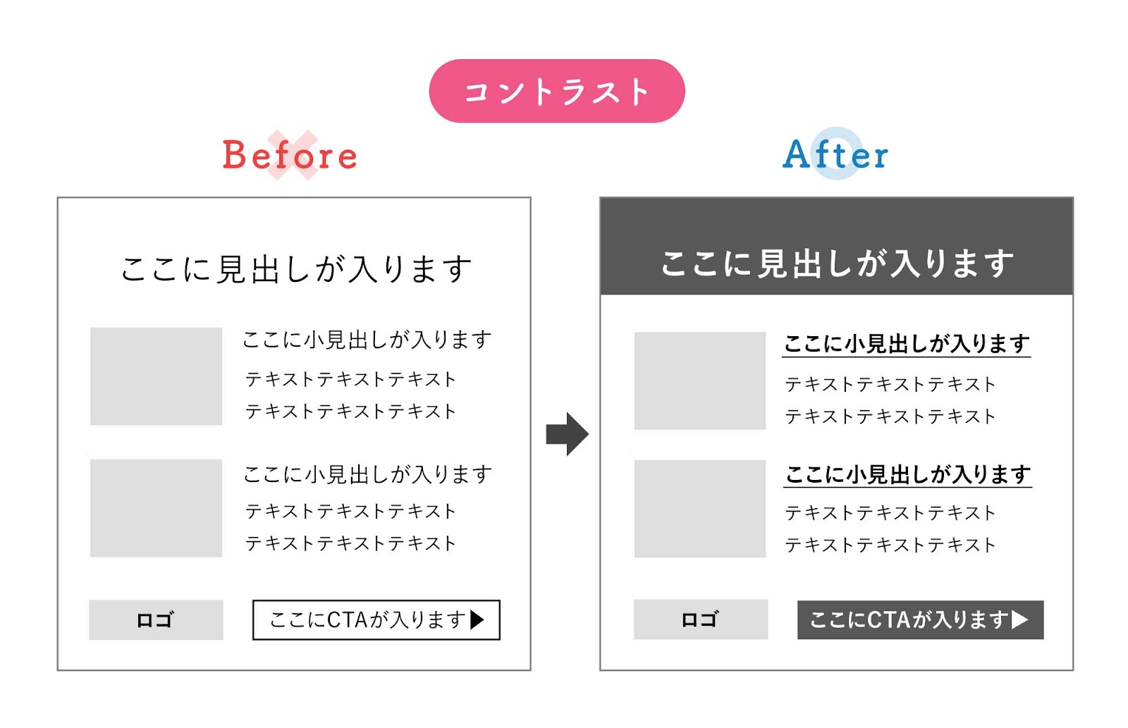 コントラストも「反復」と同じく視覚的な面白さを生み出すことができます。見出しのフォントを本文の2倍くらいに拡大したり、色を反転させて強調するなど、思い切って大胆に差をつけると効果的です。