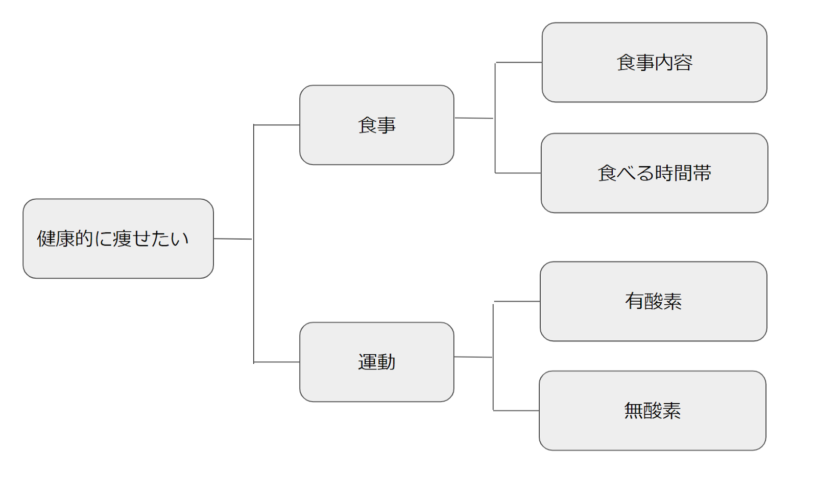 たとえば、「健康的に痩せたい」という問題をロジックツリーで表すとこのように分解できます。